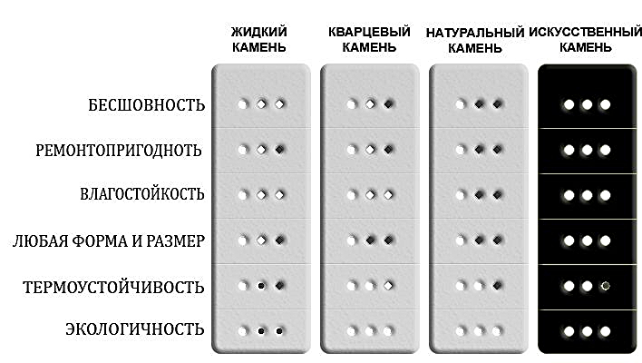 Искусственный камень выгодно отличается по всем параметрам! Он включает в себя все качества других материалов, при этом оставаясь абсолютно экологически чистым материалом с возможностью изготовления изделий любого размера и нестандартной формы. При высокой степени твёрдости и термоустойчивости искусственный камень обладает уникальной ремонтопригодностью при сильных повреждениях без необходимости замены изделия целиком.